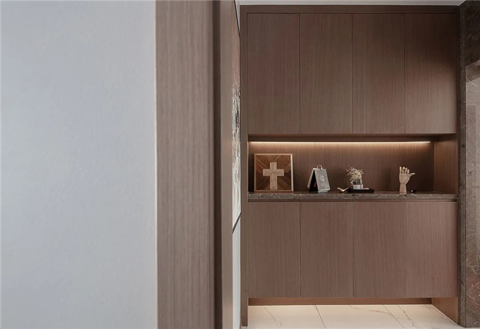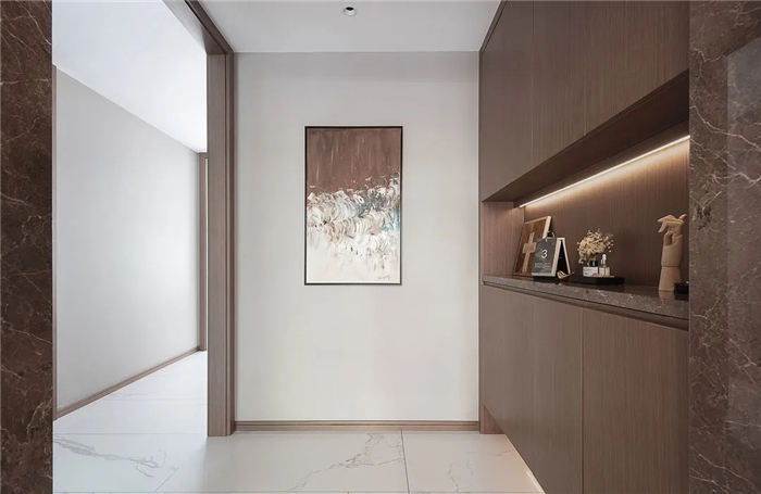 一幅与木质纹路玄关柜色调统一的装饰画,成为进入家的起始笔触。