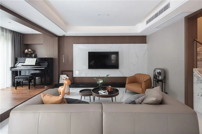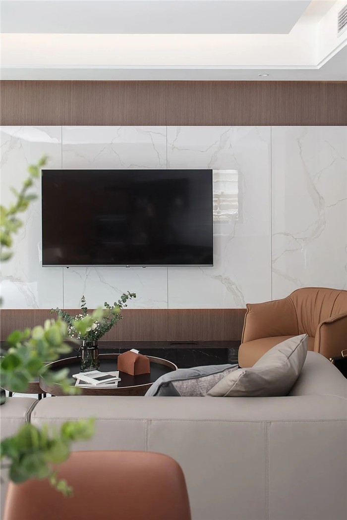 电视墙采用白色瓷砖元素,以大面积华丽自然的质感与纹理搭配,使得空间更具现代感、时尚感。