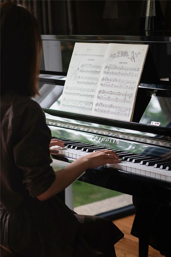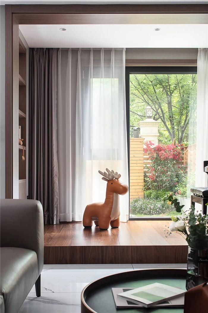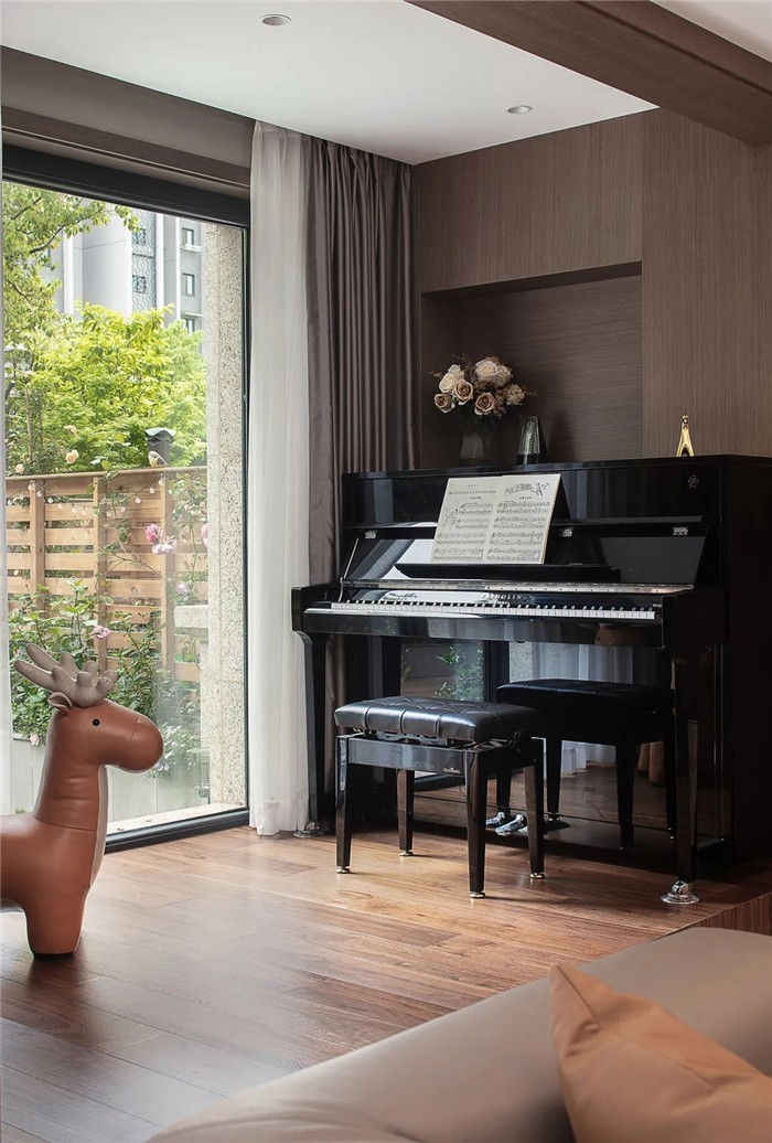 琴房采用开放式设计,以坐高的形式开辟出一处新的空间,整面的落地窗带来了空间的通透感,仿佛听到音符与阳光交织的声音。皮面的小鹿椅,增添了空间意趣。