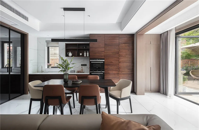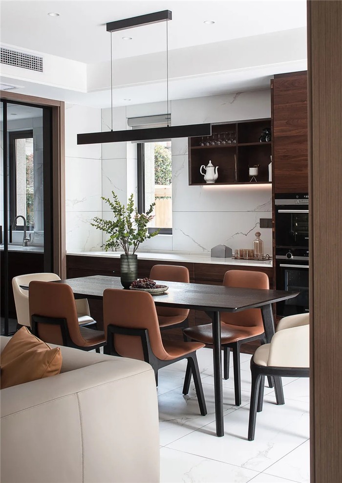 皮质的餐桌椅根据人体工程学打造最为舒适的弧度,皮质与餐桌的木质搭配,实现了现代与自然的完美融合。