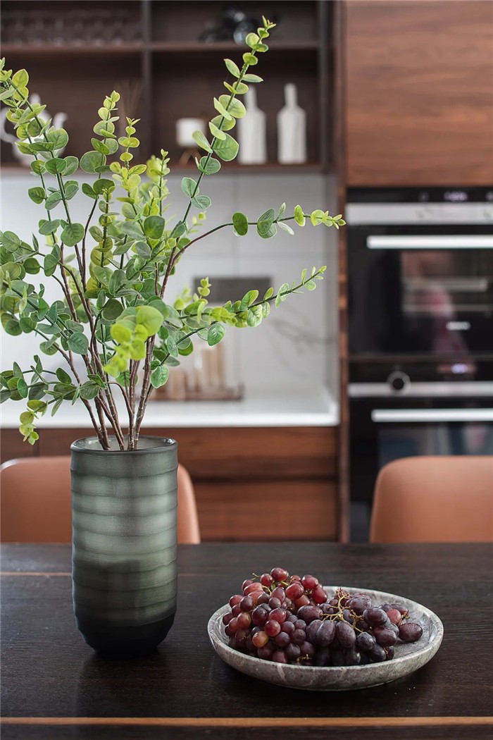 黑色的烤箱镶嵌于木质橱柜中,实现自然的质感与现代电器的融合。家人闲坐,灯火可亲。