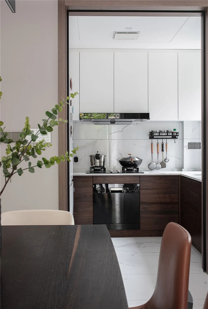 厨房采用对比颜色更为强烈的白色瓷砖与深棕色木纹,交融呼应出生活的本相,更交叠出空间的层次感。在做菜时,自然光入景怡情,让人身心愉悦。