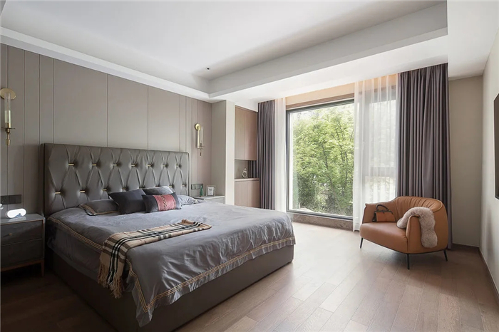 主卧空间色调清中有雅,白灰色在木质面的映衬下更显静谧。整面的落地窗将光线映入室内,让主卧增添了自然气息。