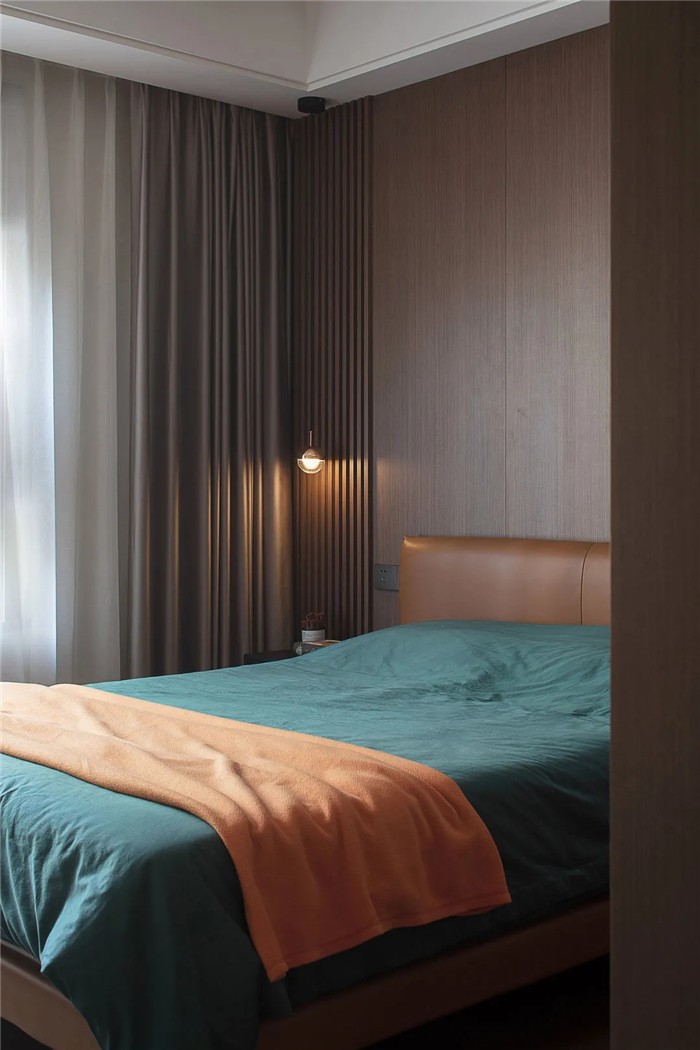 次卧延续整个空间的特色,在风格上保持一致。透过窗帘映入室内的光线与鲜活橙色布艺让睡眠区变得更为柔软舒适。白色的百叶窗让空间兼顾美观舒适的同时,植入宁静纯粹的精神观感。