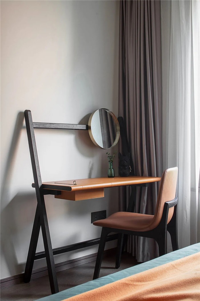 透过空间氛围的营造让居住者与空间情绪深度共鸣。充满设计感的化妆台搭配圆型的镜子,开启惬意精致的一天。