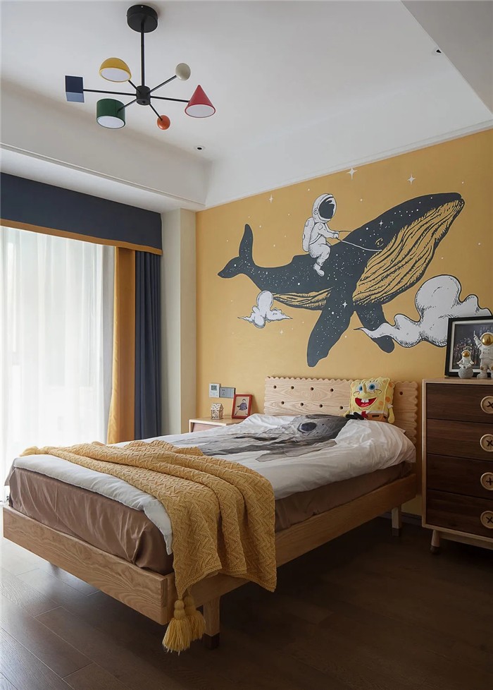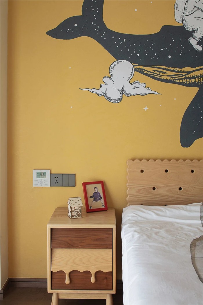 孩子的世界是天马行空的世界,儿童房以明亮的黄色作为主色调,极具想象力的墙面插画带给空间无限的创造力,挥洒孩子不竭的好奇心。