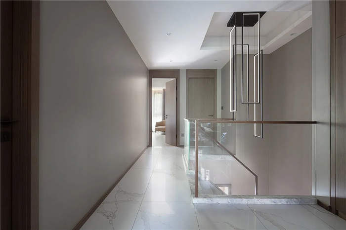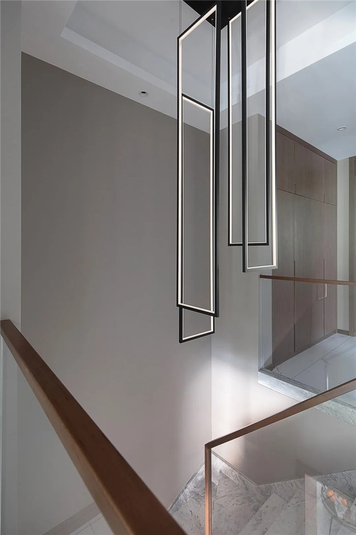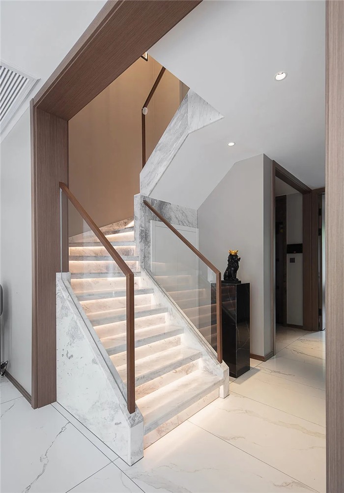 挑高的楼梯区将精致的生活格调层层铺开,灰白纹路的大理石台阶辅以暖黄的灯带,中和了清冷之气。