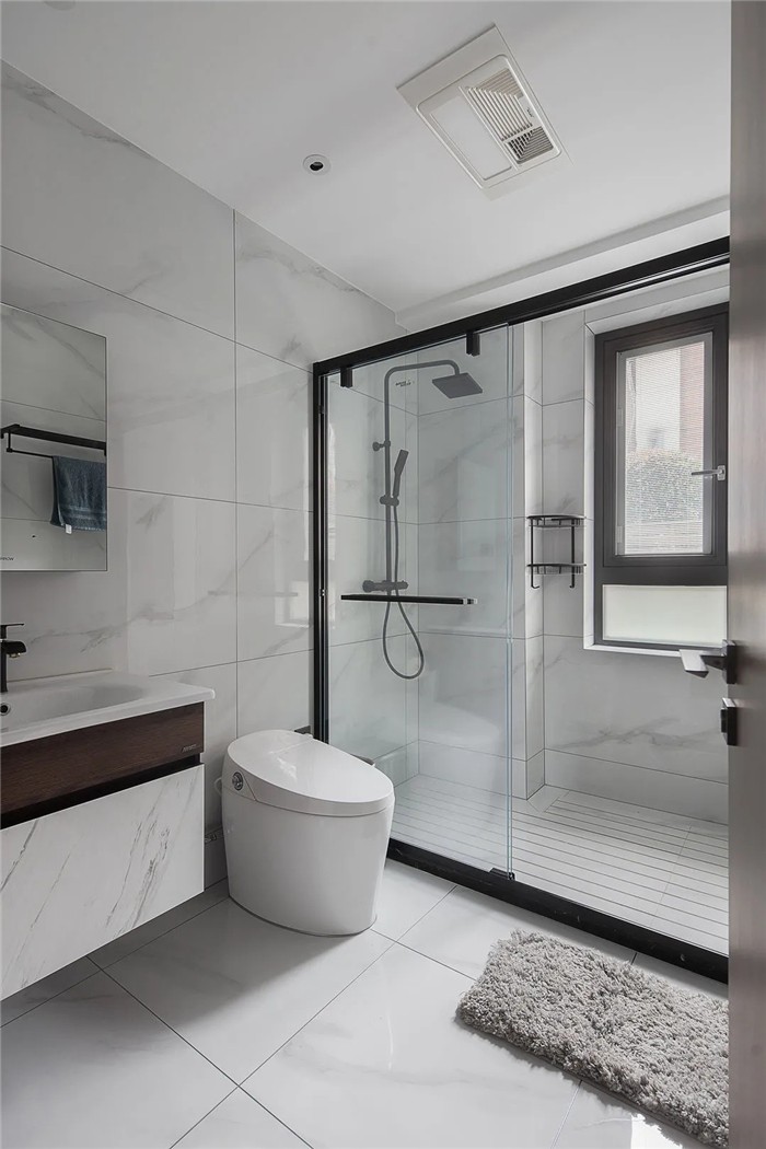 一楼卫生间总体采用白色调,大面积的白色瓷砖在视觉上扩大了空间,传递一种平和、明亮之感,干湿分离的设计使得其更具功能化。