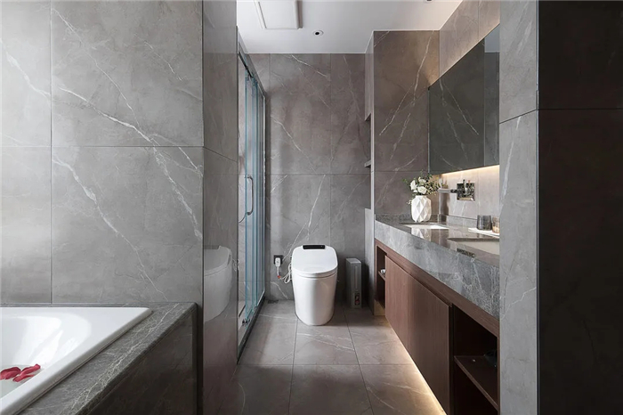 本案属于现代风,融合木饰面与瓷砖的设计,采用令人感到舒适的中性色,尽量保持原木的外观、颜色和纹理,以突出原木的原始感和自然感,并代入瓷砖的现代感,塑造出了一种宁静之感。