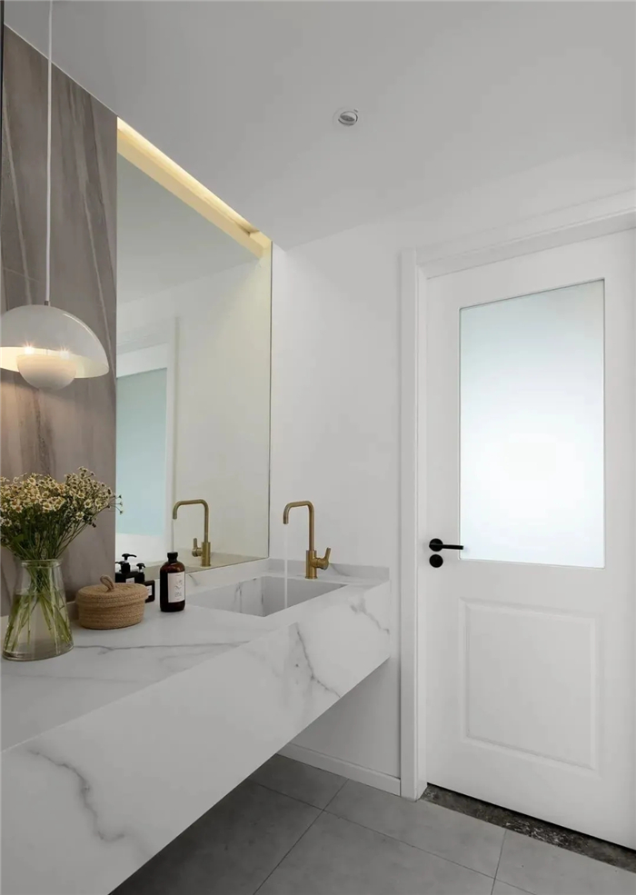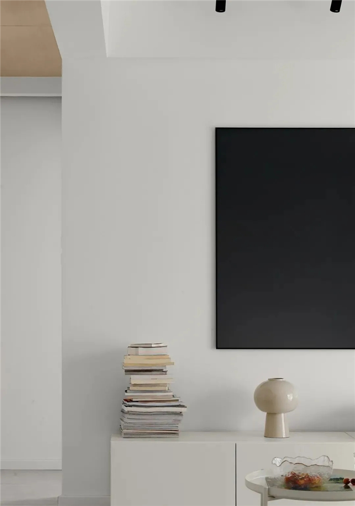 ▲ 电视墙以灰色木饰面为底结合白色石材打造出层次感背景,底部设计黑色大理石地台取代电视柜