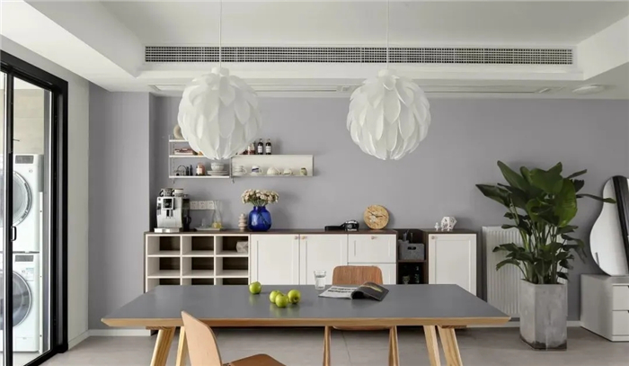 ▲ 餐厅背景做了整面收纳柜,同时也解决了空调的回风问题,大理石岛台不仅仅作为操作台面,它还是一个半高的酒柜