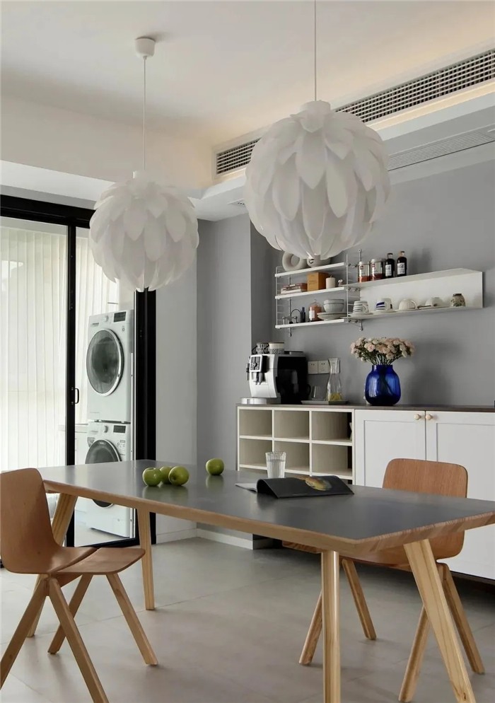 厨房与客厅之间的分区元素也可以是一个功能部分——餐厅。将餐桌和餐椅放置在两个空间的连接处,不仅可以使空间设计更显连贯,还可以为厨房起到一定的缓冲作用。