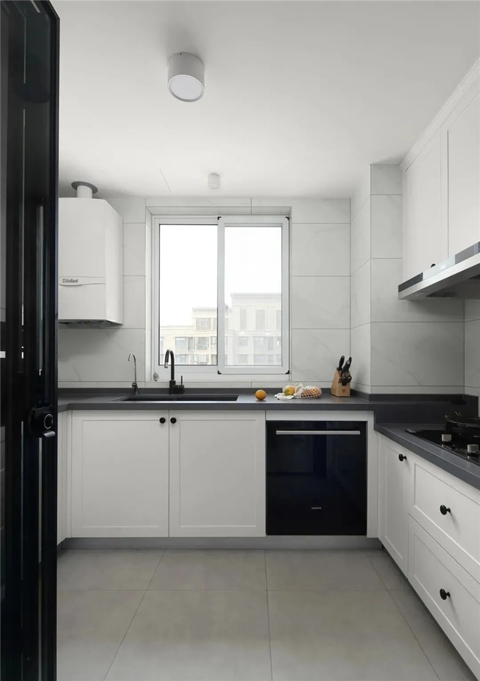 ▲ 厨房U型布局,上浅下深的橱柜配色更显层次
