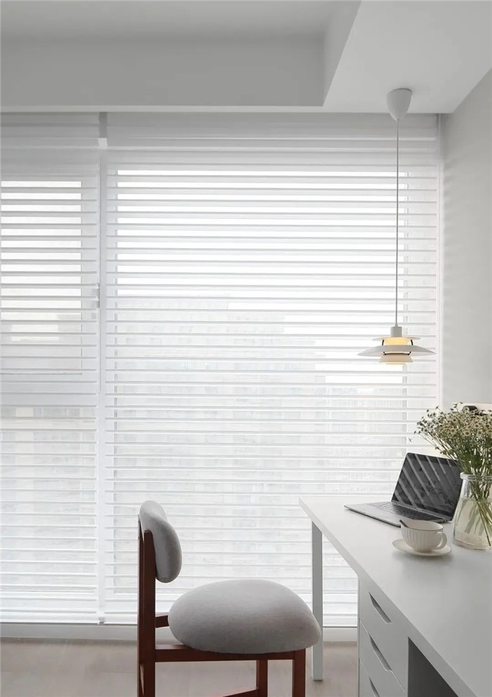 ▲ 进门右手边是开放式书房,定制L型收纳柜,采用封闭式与开放式组合,功能强大