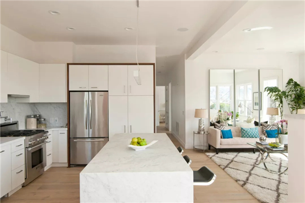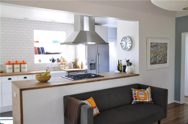 3、在装修开始之前,就应该最大限度的减少开放式厨房的缺陷。所以在必要的地方要多投入一些资金,比如购买无噪音的家用电器、使用方便清洁的家居建材。