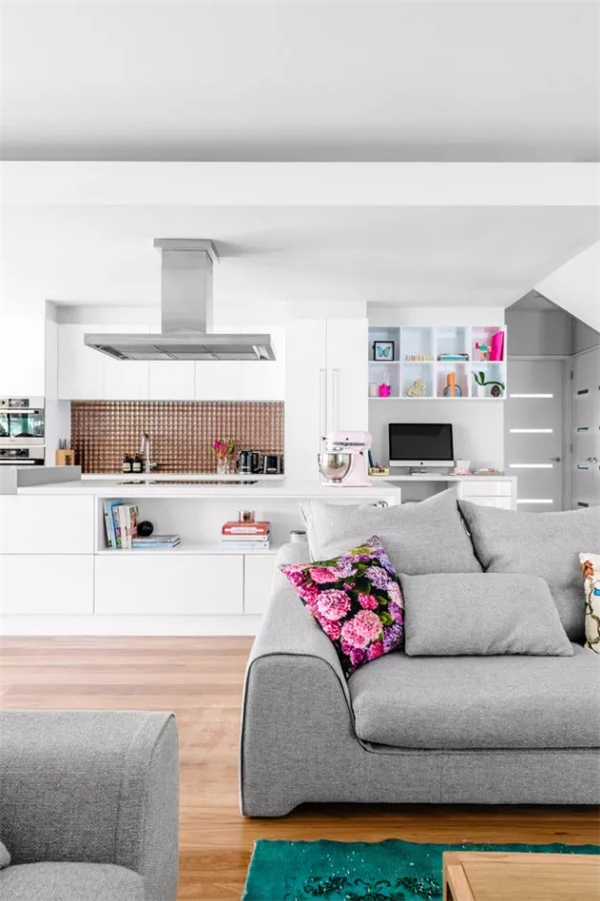 还有一类惹人喜欢的设计巧思——将岛台作为一种连接。从厨房角度看,岛台可以用来储物或者放置嵌入式家具,而在客厅的一端,岛台可以做为书架,充当小的读书角。
