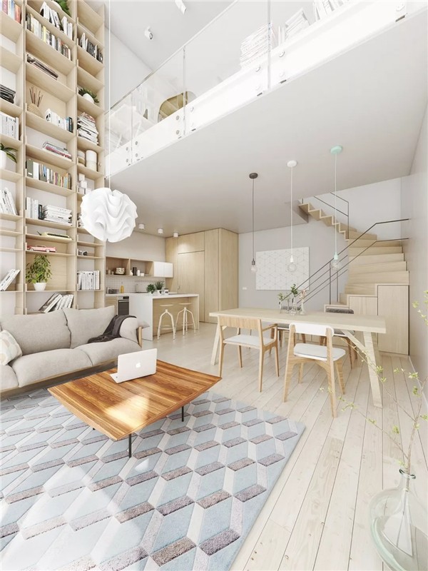 如果你的空间内层高可观,可以制造一个高低台落差,将厨房台面高于或低于客厅,制造出非常明显的功能界限。另外也可以在客厅空间铺上地毯,在视觉上形成对比。