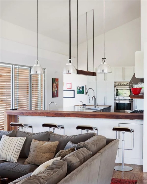 吧台的一端与墙壁相连接,这样可以非常清晰的划分出厨房与客厅的边界,你可以把它打造成一个小的餐桌,早上在这里打一杯咖啡或者吃个简餐。
