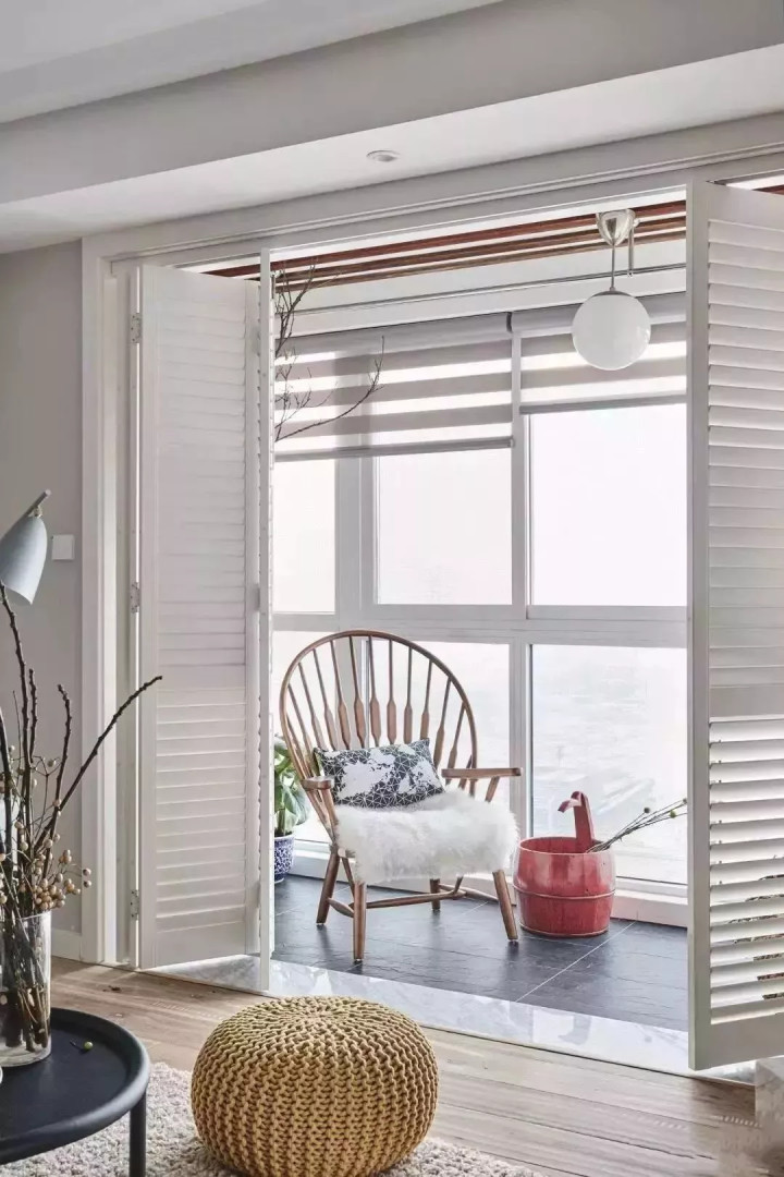 大部分屋主会选择给阳台和客厅之间加上门,但普通的玻璃推拉门就没有这样的折叠百叶门好看,折叠百叶门不搭配窗帘也能保证隐私性。