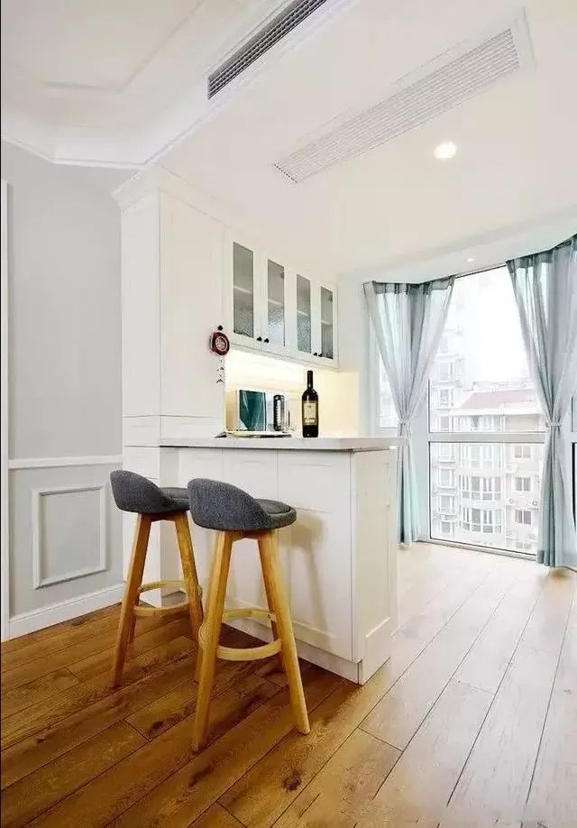 做门的一角说完了,那就来说说不做门的阳台该怎么布置吧,比如给它做一个吧台作为隔断,然后把阳台打造出一个休闲与实用兼备的空间。