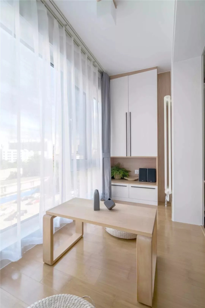 约上三五好友在这里泡茶、聊天、打牌是非常惬意的事情,给这个空间加上一层纱帘,也能避免阳台太过刺眼、阳台太热。