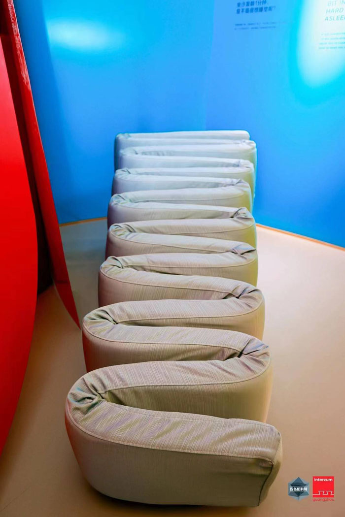 本次展出围绕荷兰青年设计工作室Enrichers的睡眠研究报告,通过物体和空间来引导情绪释放,并结合温度、灯光的调节给出优质睡眠建议,探索能与观众共情的产品设计。在世界睡眠日的大背景之下,现场沉浸式的睡眠体验场景吸引了不少观众驻足,引发大家对于睡眠的思考,提升大众对提高睡眠质量的重视。