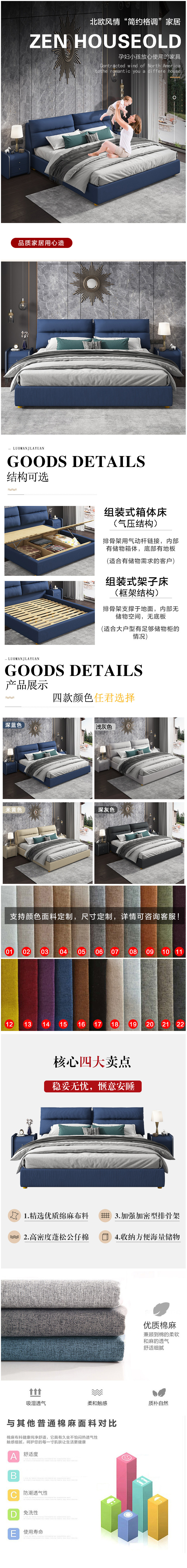 布艺双人床 现代1.8米软包床 1.5米主卧棉麻布床