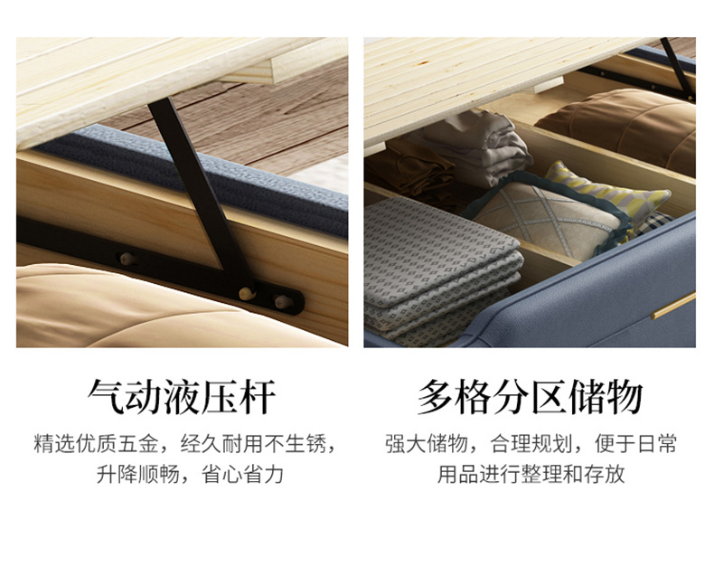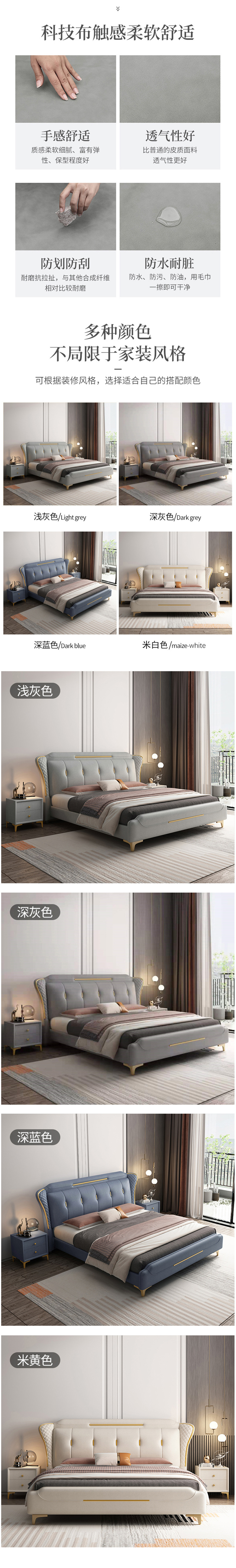 Description: 免洗科技布1.8米双人主卧大床软包床轻奢风1.5现代简约高箱储物床;型号:211;结构:框架结构;面料:科技布......