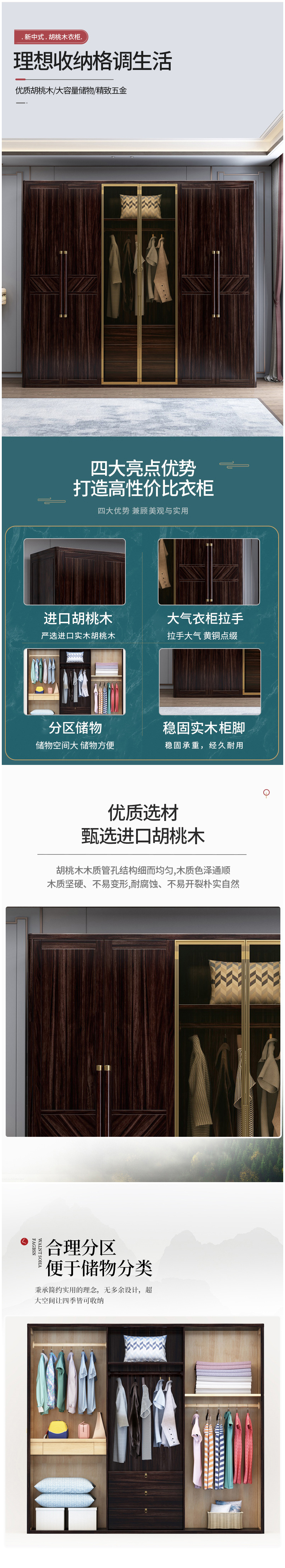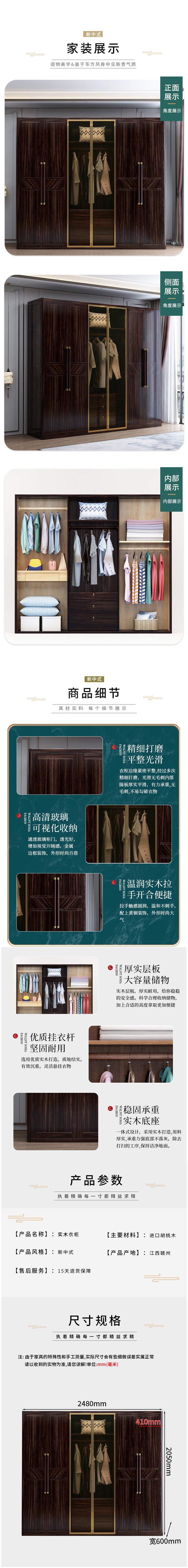 新中式家具 胡桃木实木双人床 对四五开门储物大衣橱