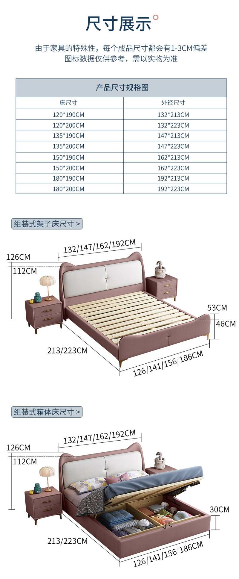 北欧轻奢真皮床科技皮床简约现代1.2m儿童床女孩粉色公主床软体床;型号:309#,皮革材质:纳帕皮,产品类别:高箱...[View]