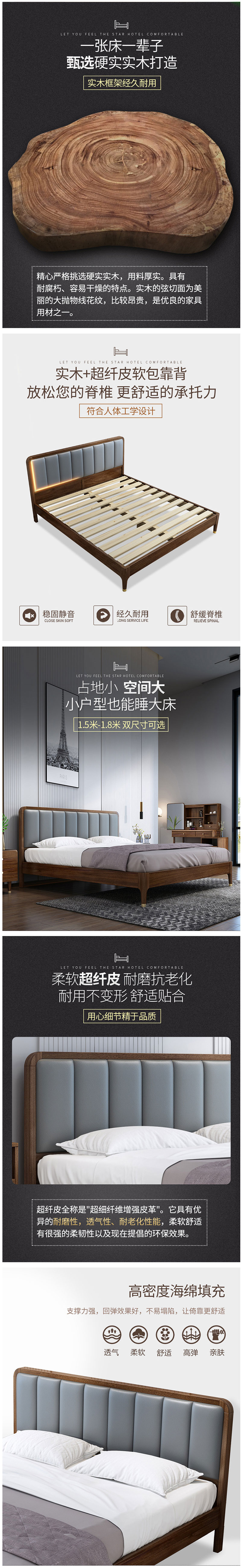 Description: Nordic solid wood bed 1.8m double bed Master bedroom soft bed Modern simple walnut bed light luxury furniture; Model: M8036; Material: solid wood; Product category: Frame structure......