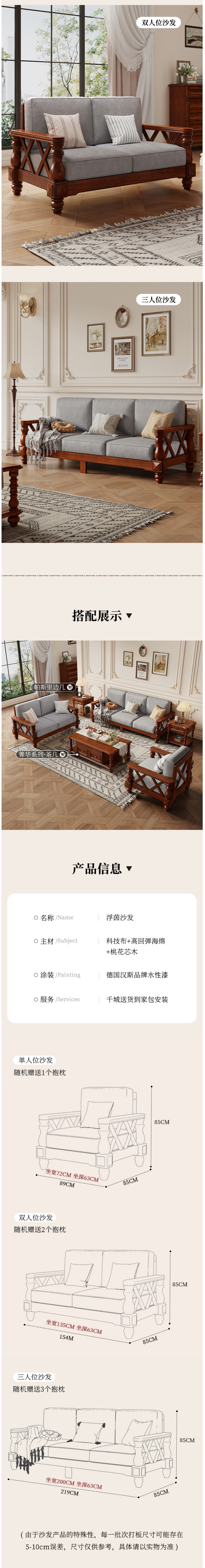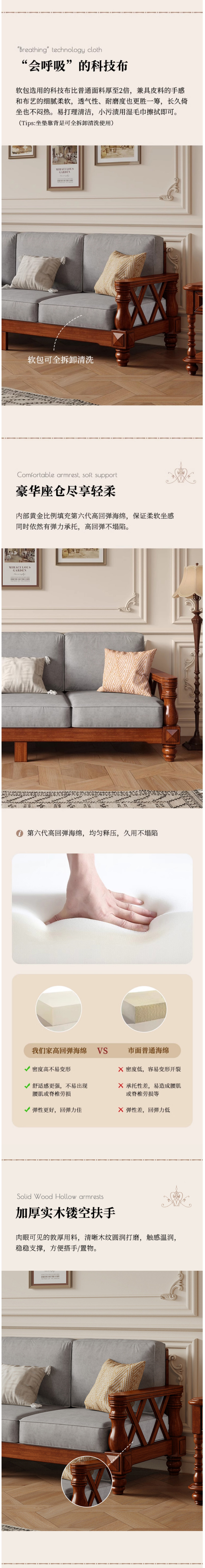Description: American solid wood sofa retro country living room fabric sofa; Wood material: mahogany; Model :HYMJ(H16#); Internal filler: high-density sponge; Style: American......